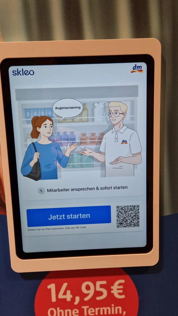 Hinter dem Augen-Check steht Skleo Health, gegründet 2024 vom Augenarzt Dr. Steffen Emil Künzel (zuvor Charité Berlin) gemeinsam mit dem Maschinenbauer Fabien Vogl. Das Unternehmen hat sich zum Ziel gesetzt, augenärztliche Versorgung über Telemedizin und KI breiter zugänglich zu machen – und kooperiert neben dm auch mit Mister Spex, wo derselbe Test allerdings 49,95 Euro kostet.